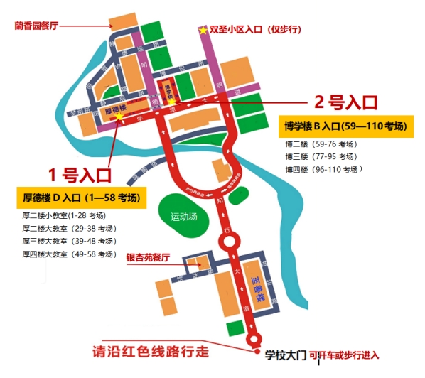 (1)第001-058号考场考生从考区1号入口(厚德楼d入口)进入。