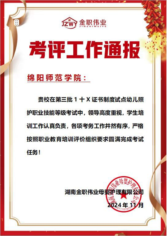 考评结束后,湖南金职伟业公司母婴护理有限公司工作人员和校外督导员、考评员一致认为,我校在1 x证书考评中,严格按证流程精心组织,严守纪律,严肃考风,领导高度重视,各项考务工作井然有序,严格按照职业培训评价标准圆满完成了本次考评任务。