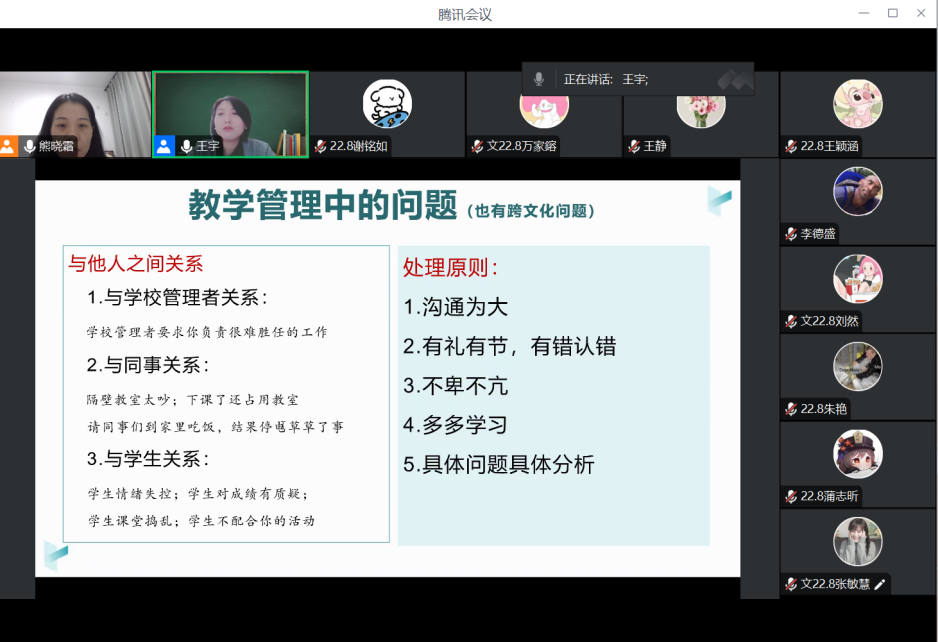 12月10日,文学与历史学院汉语国际教育专业开展了专业见习暨国际中文教学实践专题讲座。讲座特邀东北师范大学国际汉学院硕士生导师王宇副教授主讲,以线上会议形式进行。汉语国际教育系主任、骨干教师及22级、23级全体同学参会。