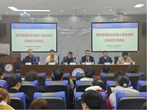 江跃勇首先对赵小林一行的到来表示欢迎,代表学校热诚欢迎地方龙头企业参与到社会紧缺人才的联合培养中,以实现学校、企业和学生的三赢。他要求全体学员一要珍惜机会,努力学习。定制班是学校与企业通过沟通、协调,解决了一系列机制体制困难后,才得以实现开班。机会来之不易,同学们要把握机会,努力学习,提升能力,早日实现梦想。二要摆脱惯性,主动学习。校企双方教学团队会为学员提供优质师资和真实实践环境,为有志青年提供成长成才的肥沃土壤。全体学员要自觉学习、主动学习、积极学习,形成互帮互助的学习小组,实现共同进步。三要重视实践,培养才干。社会企业需要的不是纸上谈兵的“空谈家”,而是有热情、肯干事的“实干家”。全体学员要虚心向企业经理、师傅们“拜师”,学习经营管理中的实操经验,用心体会餐饮行业的酸甜苦辣。四要注重能力,全面发展。全体学员要以成为一名优秀企业管理人员来严格要求自己,注意能力的全面发展。既要懂餐饮行业知识,又要能看懂帐目,知道如何控制成本和制定企业发展方向。既要考核合格,顺利被企业录用,又要考取国家职业经理人资格证,为自己将来发展增添有力筹码。
